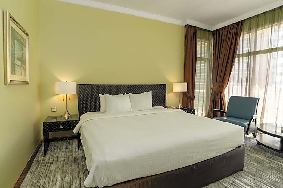 A spacious, air-conditioned room that features a seating area, a desk and a mini-bar. Free toiletries are provided in the bathroom.